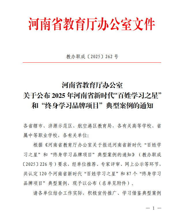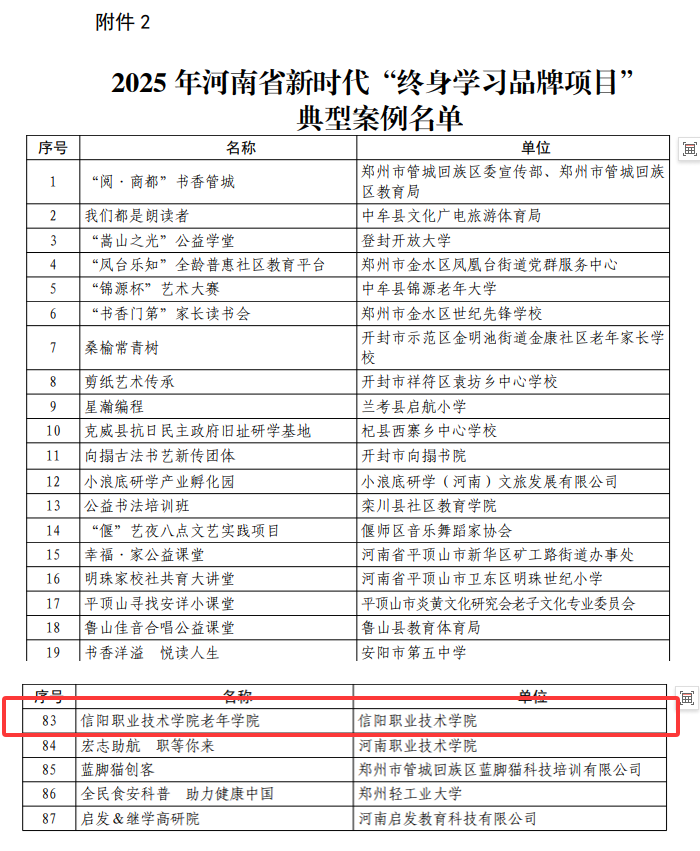 继续教育学院牵头申报的信阳职业技术学院老年学院荣获2025 年河南省“终身学习品牌项目”典型案例。