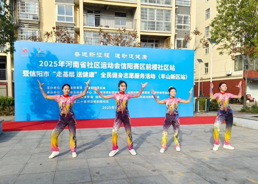 为深入推进全民健身国家战略与终身教育体系建设深度融合,让专业体育资源直达基层、服务群众,近日,2025年河南省社区运动会信阳赛区前楼社区站暨信阳市“走基层 送健康”全民健身志愿服务活动圆满举行。本次活动由河南省全民健身中心、信阳市教育体育局、信阳市体育总会承办,信阳职业技术学院体育学院充分发挥体育教育专业优势,将高校专业资源转化为社区惠民动能。同时,依托 “信阳职业技术学院二十里河街道终身教育教学点暨羊山新区社区学院” 平台,联合信阳市运动操舞协会、信阳市社会体育指导员协会、羊山新区二十里河街道前楼社区等多家单位共同协办。活动现场举行了庄重的启动仪式,一场以专业服务为核心、凝聚多方力量的文体盛宴就此拉开帷幕。