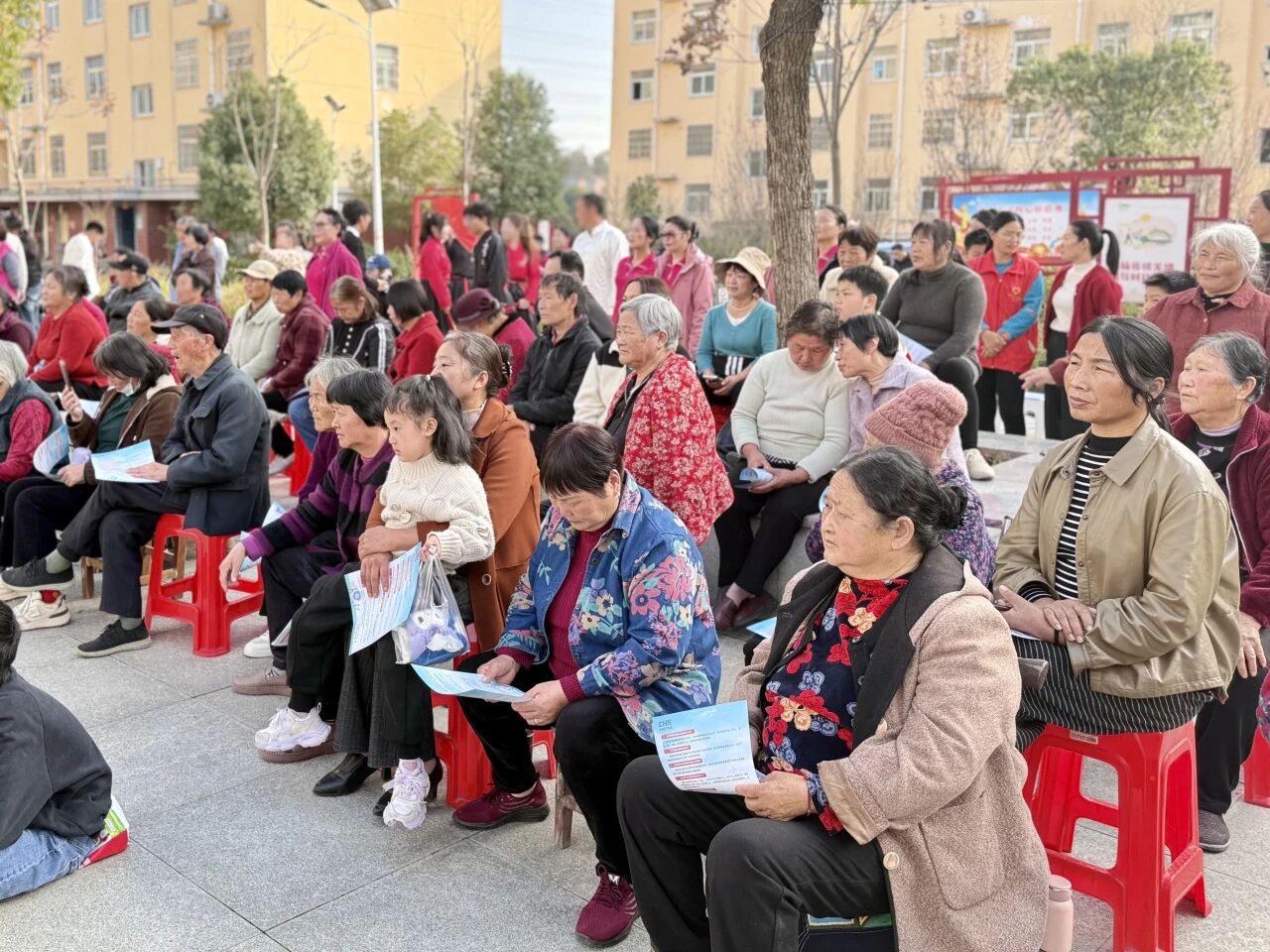 展演在一场集体盛宴中推向高潮——信阳职业技术学院体育学院师生与前楼社区居民共同组成的15人团队,带来经典养生功法《八段锦》表演。悠扬的旋律中,师生与居民们动作规范标准、舒展大方,提踵、伸臂、弯腰、转身,一招一式尽显功底。作为国家推广的健身气功项目,八段锦的集体演绎不仅展现了传统养生文化的博大精深,更体现了校社联动的深厚情谊。表演结束后,高校师生化身 “终身教育指导老师”,留下来为感兴趣的居民细致讲解动作要领,现场答疑解惑,让终身学习、科学健身的理念深入人心。
